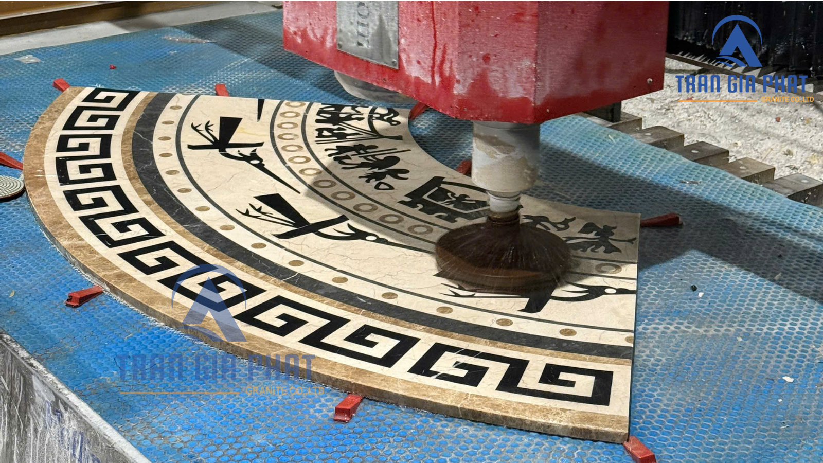 - Các công đoạn gia công: Chế tác đá hoa văn trống đồng đòi hỏi sự kết hợp giữa tay nghề thợ thủ công và công nghệ hiện đại. Hiện nay, máy CNC với đầu cắt kim cương hoặc máy cắt tia nước được sử dụng phổ biến để thực hiện các đường cắt phức tạp trên đá.